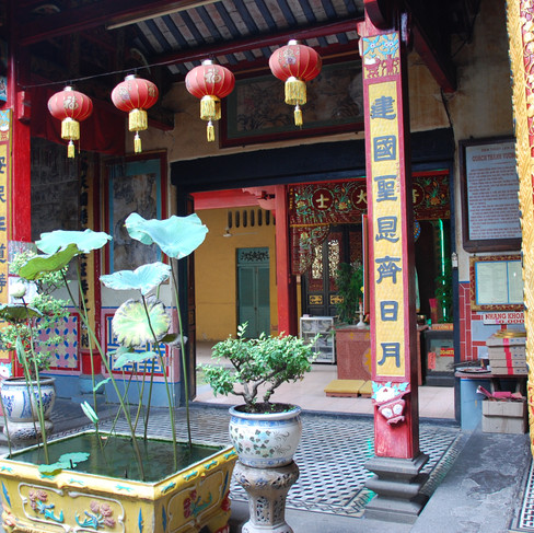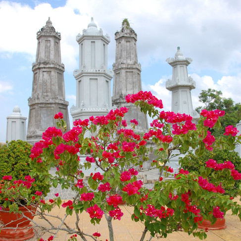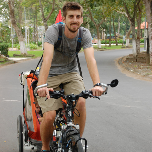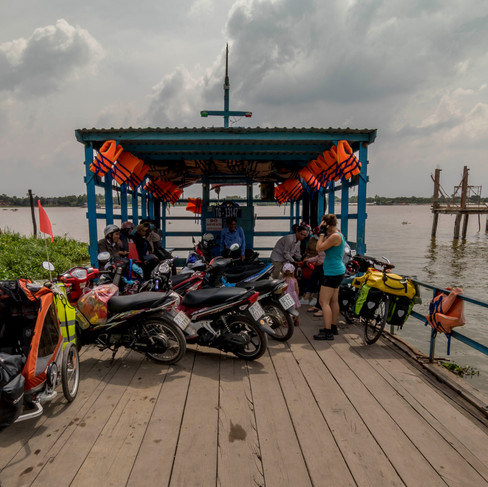 Le Vietnam que nous voyons depuis nos vélos n’est pas très beau. On imagine de belles rizières, mais on n’en a pas vu beaucoup. Il y a aussi des monocultures de fruits (oranges, fruits du dragon et bananes). Quand on quitte les grands axes et qu’on arrive sur les petits chemins de terre, le long des couloirs d’irrigation, ça devient plus joli et plus calme. C’est en général des culs-de-sac qui conduisent jusqu’aux habitations. Il y a des jardins avec des plantes exotiques, des maisons sur pilotis, des barques et des coqs colorés. Nous avons également admiré les temples bouddhistes. On les reconnaît à leur portique à la chinoise, orné de dragons. Lorsque l’on s’y aventure, sur la pointe des pieds (on ne sait pas vraiment si c’est autorisé), on se balade dans des jardins magnifiques où de grandes statues blanches semblent être en train de converser. Il y a une forte odeur d’encens et les fidèles s’adonnent à la prière.